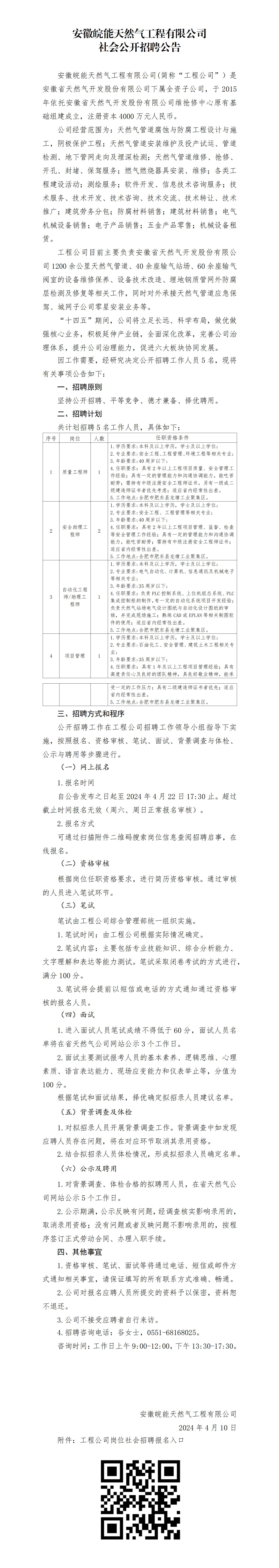 2024年安徽皖能天然氣工程有限公司社會(huì)公開(kāi)招聘公告