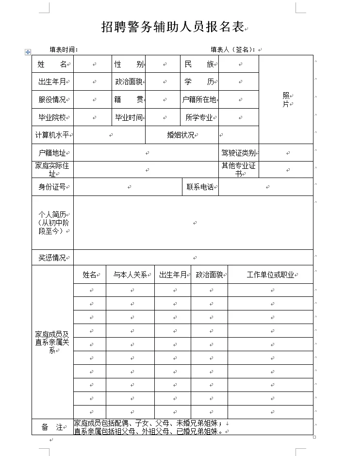 (二)填寫《2020年秋季招聘警務(wù)輔助人員報名表》一式兩份(可從附件中自行下載填寫)。