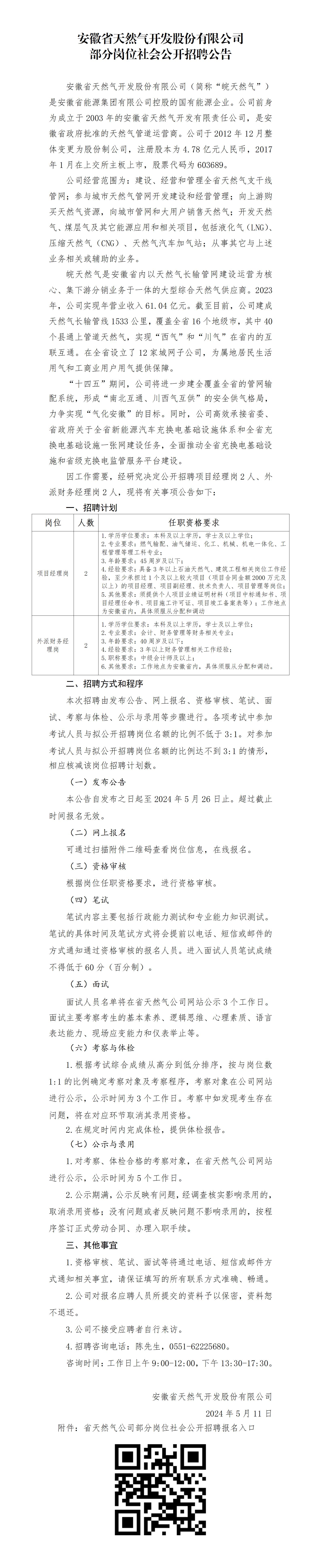 2024年安徽省天然氣開發(fā)股份有限公司部分崗位社會(huì)公開招聘公告