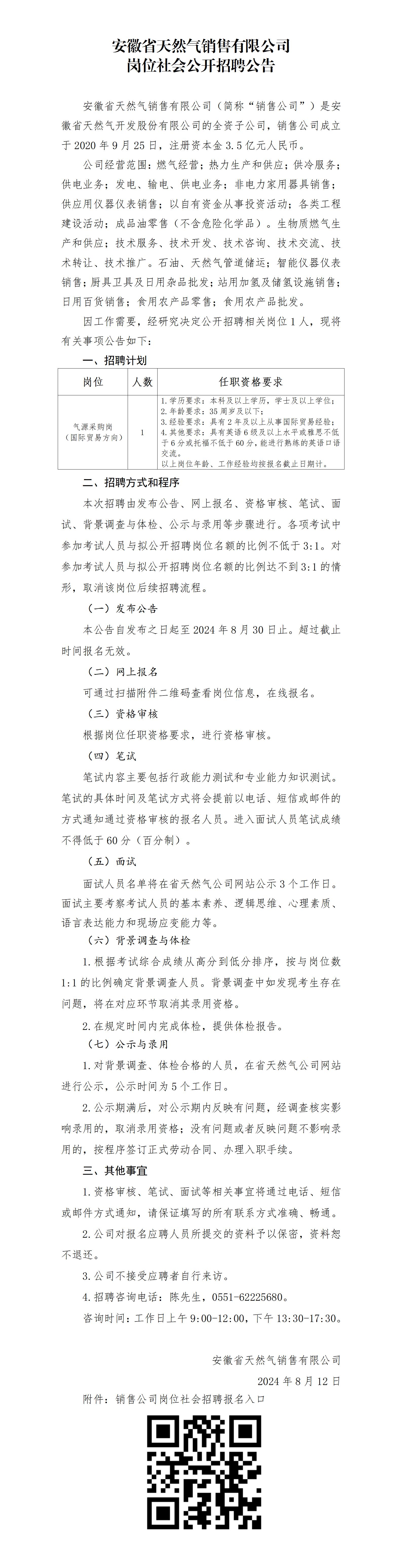 2024年安徽省天然氣銷售有限公司崗位社會公開招聘公告