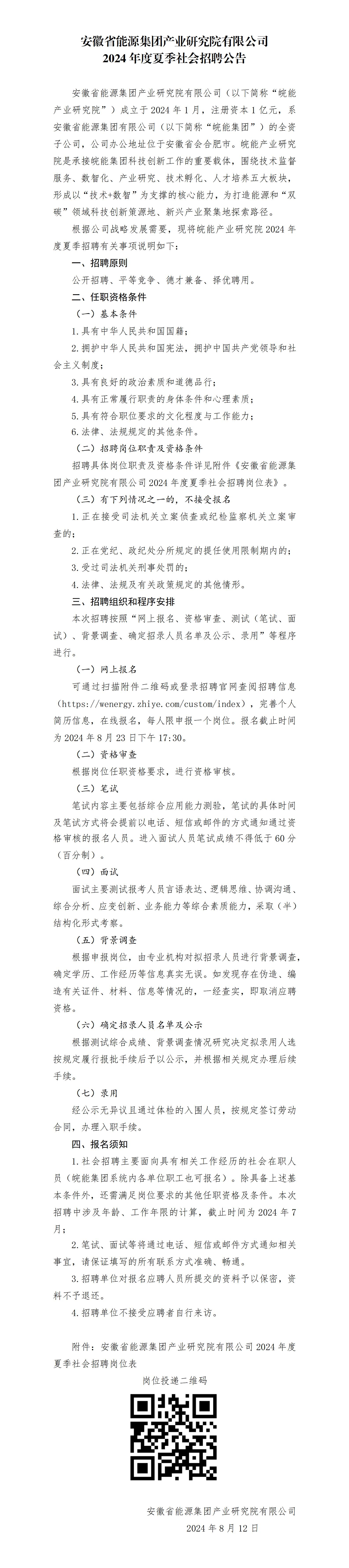 根據(jù)公司戰(zhàn)略發(fā)展需要,現(xiàn)將皖能產(chǎn)業(yè)研究院2024年度夏季招聘有關(guān)事項(xiàng)說明如下:
