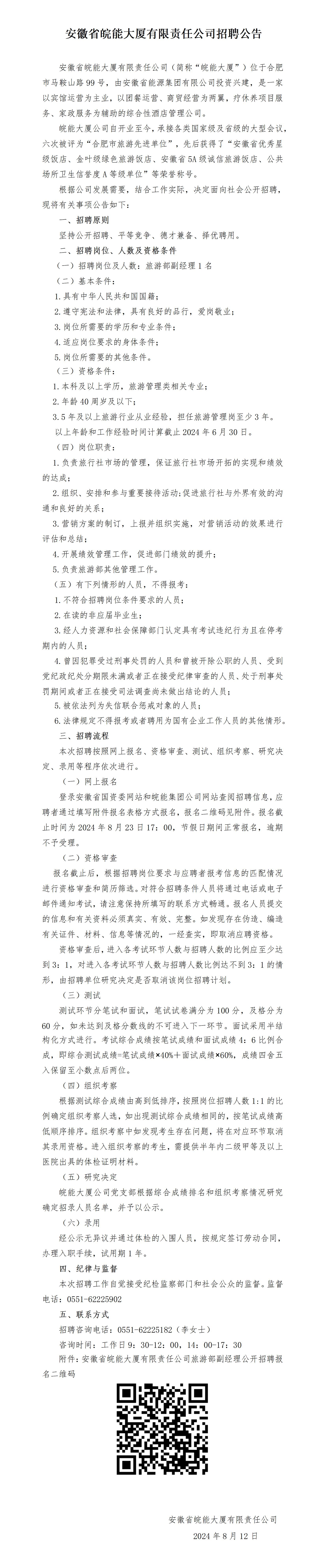 2024年安徽省皖能大廈有限責(zé)任公司招聘公告