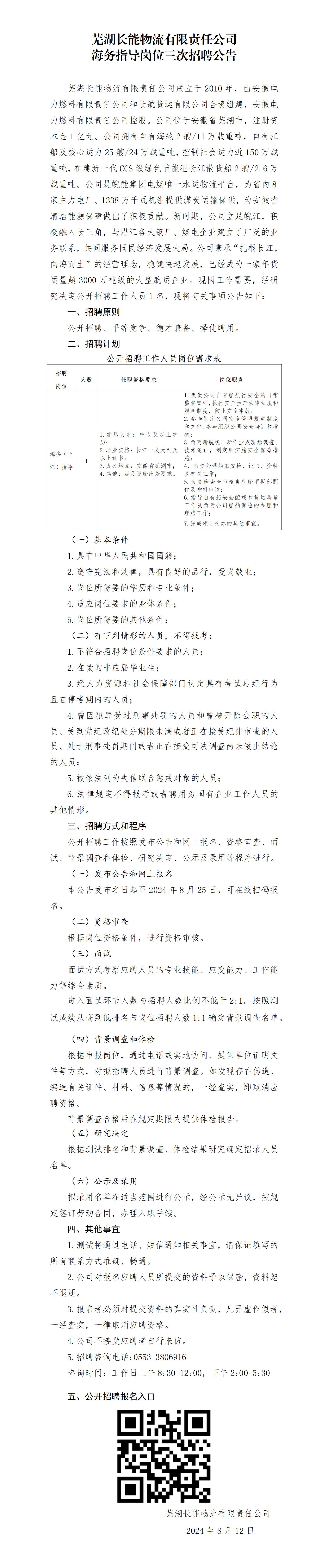 2024年蕪湖長能物流有限責任公司海務指導崗位三次招聘公告