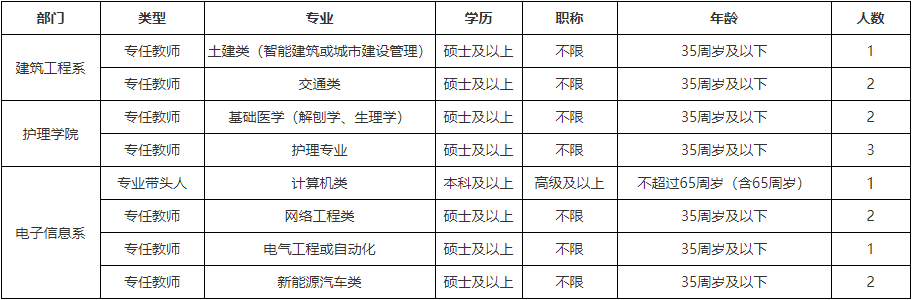 1、專業(yè)、學(xué)歷、職稱條件詳見表格,有職稱、教學(xué)經(jīng)驗(yàn)或有企業(yè)工作經(jīng)歷并取得職業(yè)資格證書者優(yōu)先。