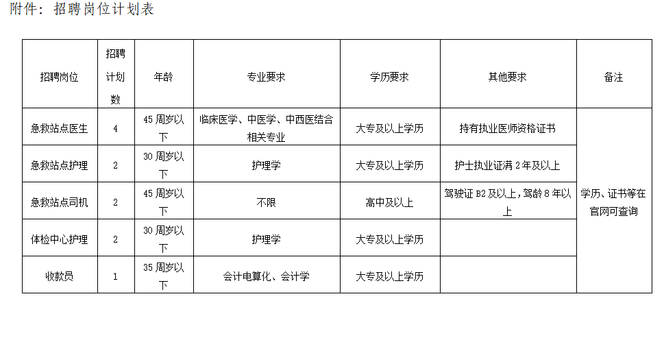 招聘急救站點(diǎn)醫(yī)生4人,急救站點(diǎn)護(hù)理2人,急救站點(diǎn)司機(jī)2人,體檢中心護(hù)理2人,收款員1人,合計(jì)11人,具體招聘崗位要求詳見(jiàn)附件。