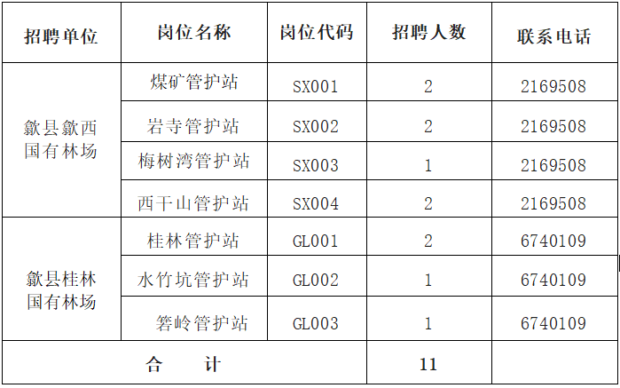 通過第三方勞務(wù)派遣方式招聘護(hù)林員共11名,其中:歙縣歙西國(guó)有林場(chǎng)7名、歙縣桂林國(guó)有林場(chǎng)4名。招聘崗位見附表。
