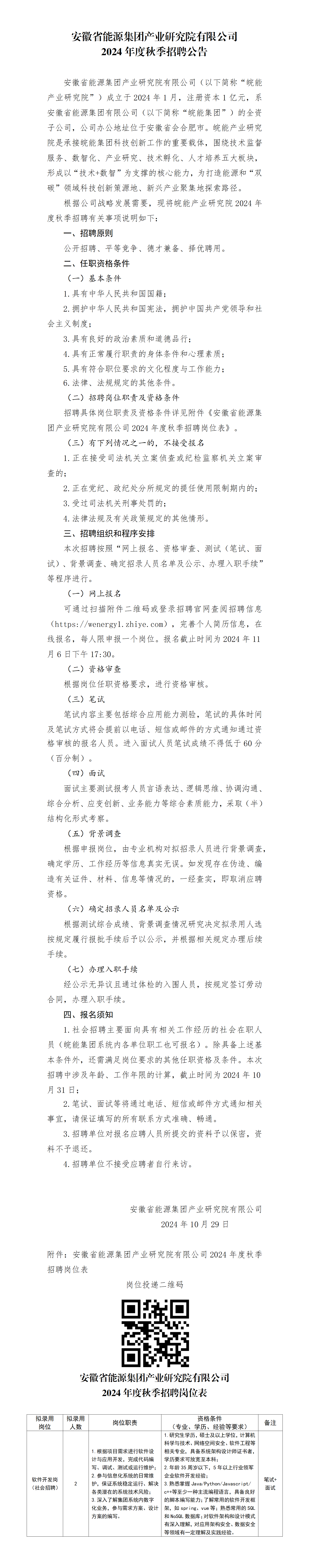 根據(jù)公司戰(zhàn)略發(fā)展需要,現(xiàn)將皖能產(chǎn)業(yè)研究院2024年度秋季招聘有關事項說明如下: