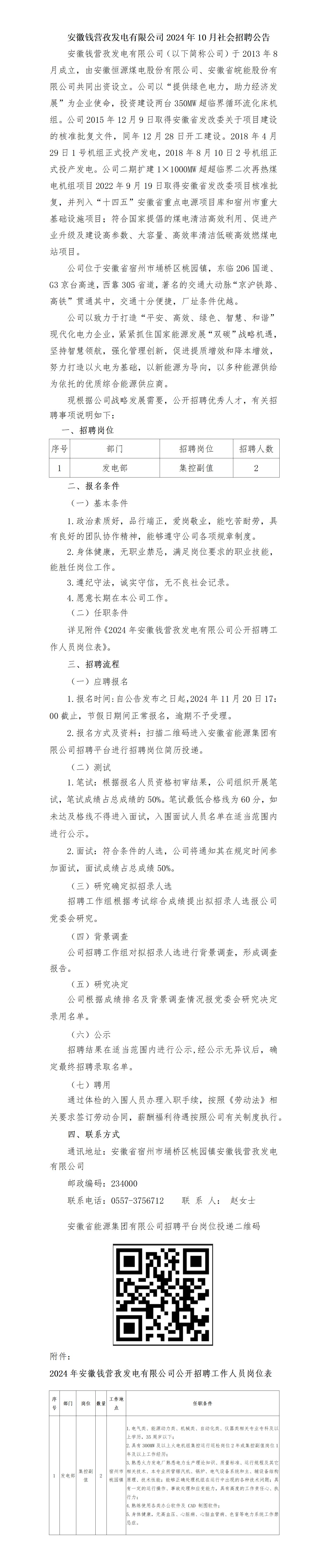 2024年宿州安徽錢營孜發(fā)電有限公司社會(huì)招聘公告