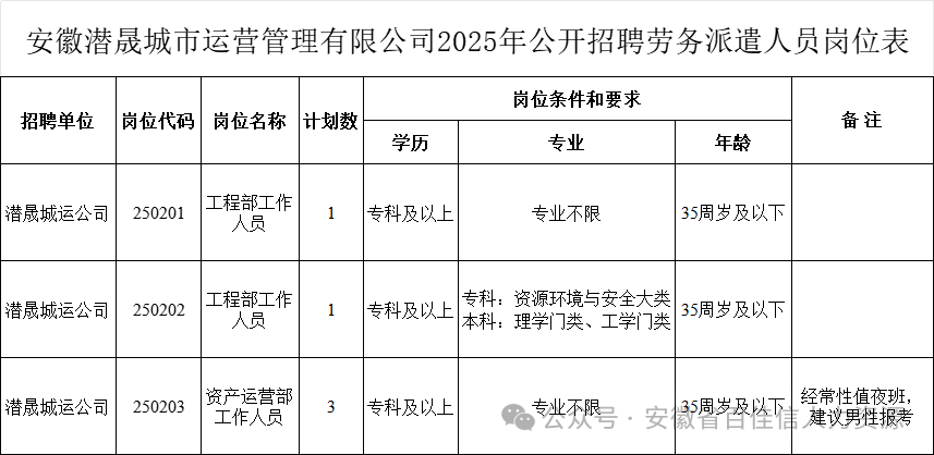 根據(jù)工作需要,安徽潛晟城市運營管理有限公司委托安徽省百佳信人力資源服務(wù)有限責(zé)任公司面向社會公開招聘勞務(wù)派遣人員5名,聘用人員將通過勞務(wù)派遣方式在安徽潛晟城市運營管理有限公司工作,現(xiàn)就招聘工作有關(guān)事項公告如下: