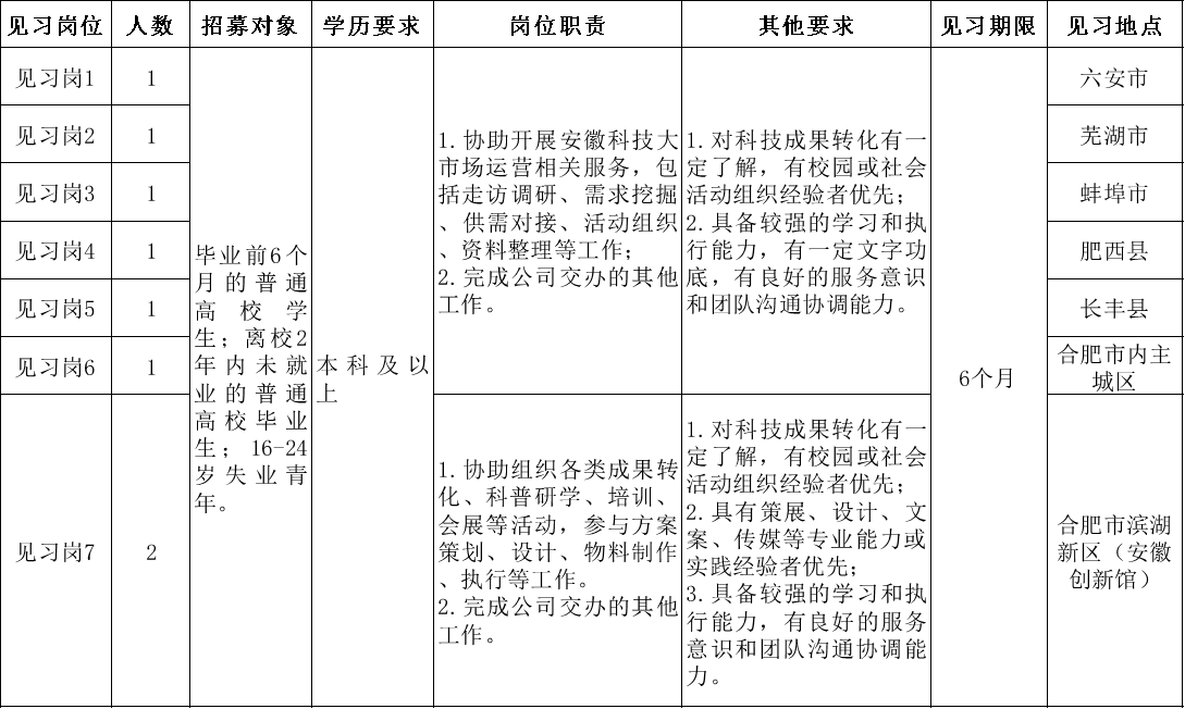 因工作需要,經(jīng)安徽科技大市場建設運營有限責任公司研究決定,委托安徽皖信人力資源管理有限公司公開招募8名見習人員?,F(xiàn)就有關事項公告如下: