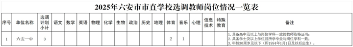 2025-05-09 09:46:55閱讀()安徽省六安第一中學(xué)根據(jù)《事業(yè)單位人事管理?xiàng)l例》(國務(wù)院令第652號(hào))和《關(guān)于開展中小學(xué)教職工編制動(dòng)態(tài)調(diào)整工作的通知》(皖編辦〔2021〕337號(hào))精神,結(jié)合教育教學(xué)需求,經(jīng)研究,決定從市轄縣公開選調(diào)教師到六安一中任教,現(xiàn)將有關(guān)事項(xiàng)公告如下: