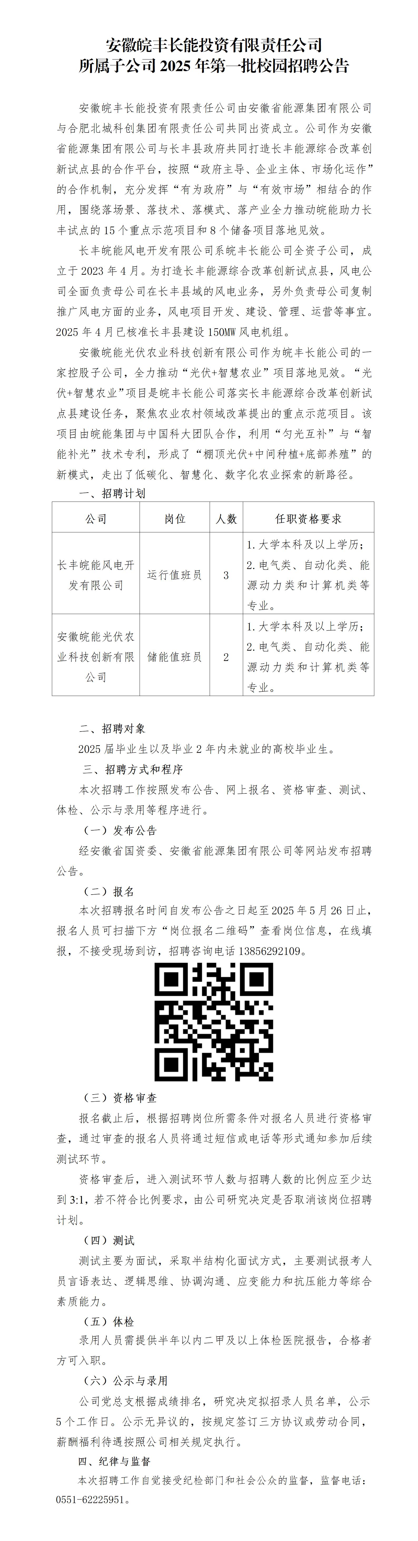 2025年安徽皖豐長(zhǎng)能投資有限責(zé)任公司所屬子公司第一批校園招聘公告