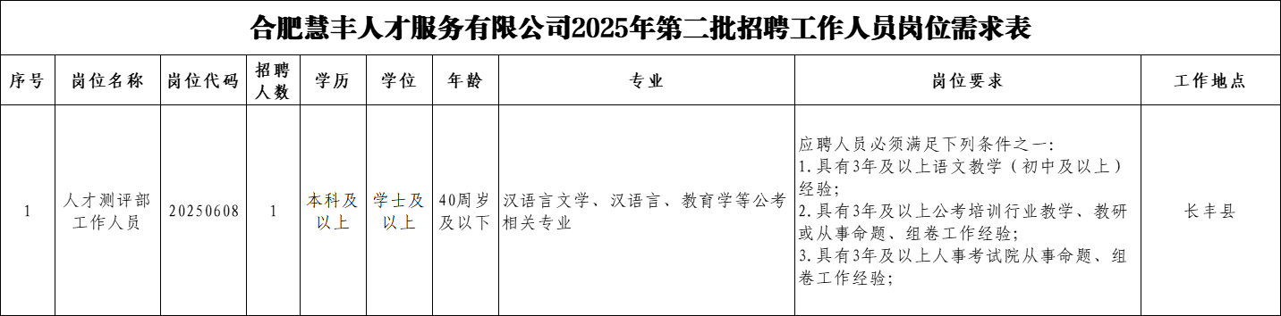 (一)招聘崗位詳見《合肥慧豐人才服務(wù)有限公司2025年第二批招聘工作人員崗位需求表》