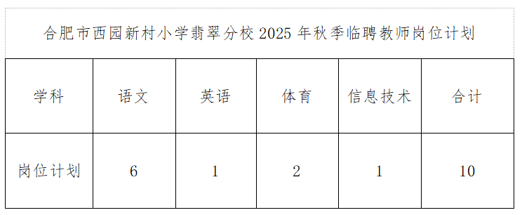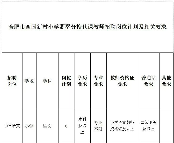 附件:合肥市西園新村小學翡翠分校代課教師招聘崗位計劃表及相關(guān)要求