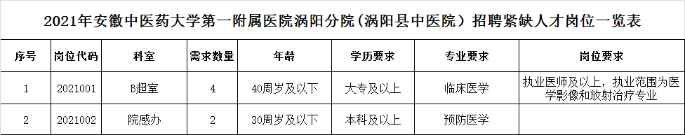 根據(jù)工作需要,需招聘緊缺人才6人,具體招聘人數(shù)和條件見(jiàn)《2021年安徽中醫(yī)藥大學(xué)第一附屬醫(yī)院渦陽(yáng)分院(渦陽(yáng)縣中醫(yī)院)招聘緊缺人才崗位一覽表》(附件1)