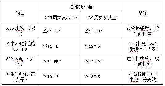 體能測試項目:男子1000米跑、女子800米跑,4×10米往返跑。測試標準參照《公安機關(guān)錄用人民警察體能測評項目和標準(暫行)》適當(dāng)放寬。