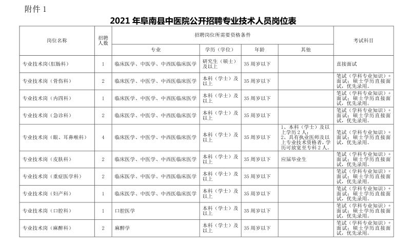 附件1:《2021年阜南縣中醫(yī)院公開招聘專業(yè)技術人員崗位表》