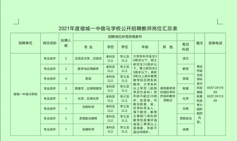 2021-05-06 22:24:18閱讀()宿州市教育體育局根據(jù)省委組織部、省人力資源和社會(huì)保障廳《關(guān)于印發(fā)<安徽省事業(yè)單位公開(kāi)招聘人員暫行辦法>的通知》(皖人社發(fā)〔2010〕78號(hào))規(guī)定,經(jīng)市政府同意,宿城一中宿馬學(xué)校根據(jù)工作需要面向社會(huì)公開(kāi)招聘教師,現(xiàn)將有關(guān)事項(xiàng)公告如下: