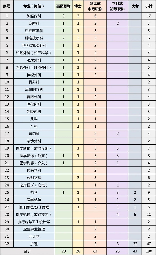 在中科院和安徽省暨合肥市的大力支持下,一所1500張床位的高水平、現(xiàn)代化三級(jí)甲等腫瘤??漆t(yī)院(高新院區(qū))正在建設(shè)中,根據(jù)醫(yī)院發(fā)展規(guī)劃,現(xiàn)面向全社會(huì)公開招聘各類專業(yè)技術(shù)人才,2020年人才招聘計(jì)劃如下: