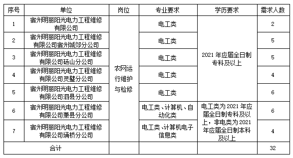 宿州明麗陽(yáng)光電力維修工程有限責(zé)任公司(以下簡(jiǎn)稱(chēng)公司)是國(guó)網(wǎng)宿州供電公司產(chǎn)業(yè)單位,主要受托開(kāi)展宿州地區(qū)所屬鄉(xiāng)鎮(zhèn)10千伏及以下配網(wǎng)設(shè)備現(xiàn)場(chǎng)巡檢維護(hù)、故障搶修,0.4千伏及以下客戶(hù)服務(wù)業(yè)務(wù)。根據(jù)公司發(fā)展需求,現(xiàn)面向社會(huì)公開(kāi)招聘。