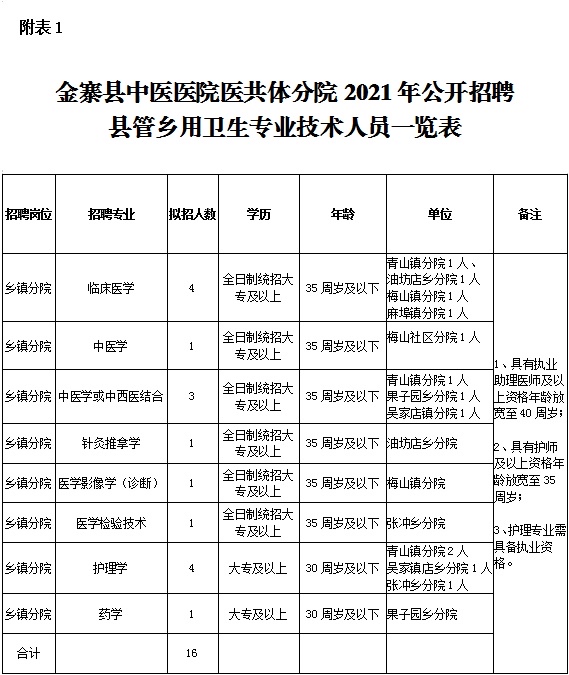 金寨縣中醫(yī)醫(yī)院醫(yī)共體分院2021年擬招聘縣管鄉(xiāng)用各類(lèi)衛(wèi)生專(zhuān)業(yè)技術(shù)人員16名(詳見(jiàn)附表1)。