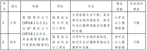 小學教師面向全縣農(nóng)村在編在崗滿3年(定崗招聘的教學點教師工作滿5年)的小學教師和2018年招聘且服務期滿留用的小學特崗教師選調,初中教師面向全縣農(nóng)村在編在崗滿3年(定崗招聘的邊遠初中教師工作滿5年)的初中教師和2018年招聘且服務期滿留用的初中特崗教師選調。