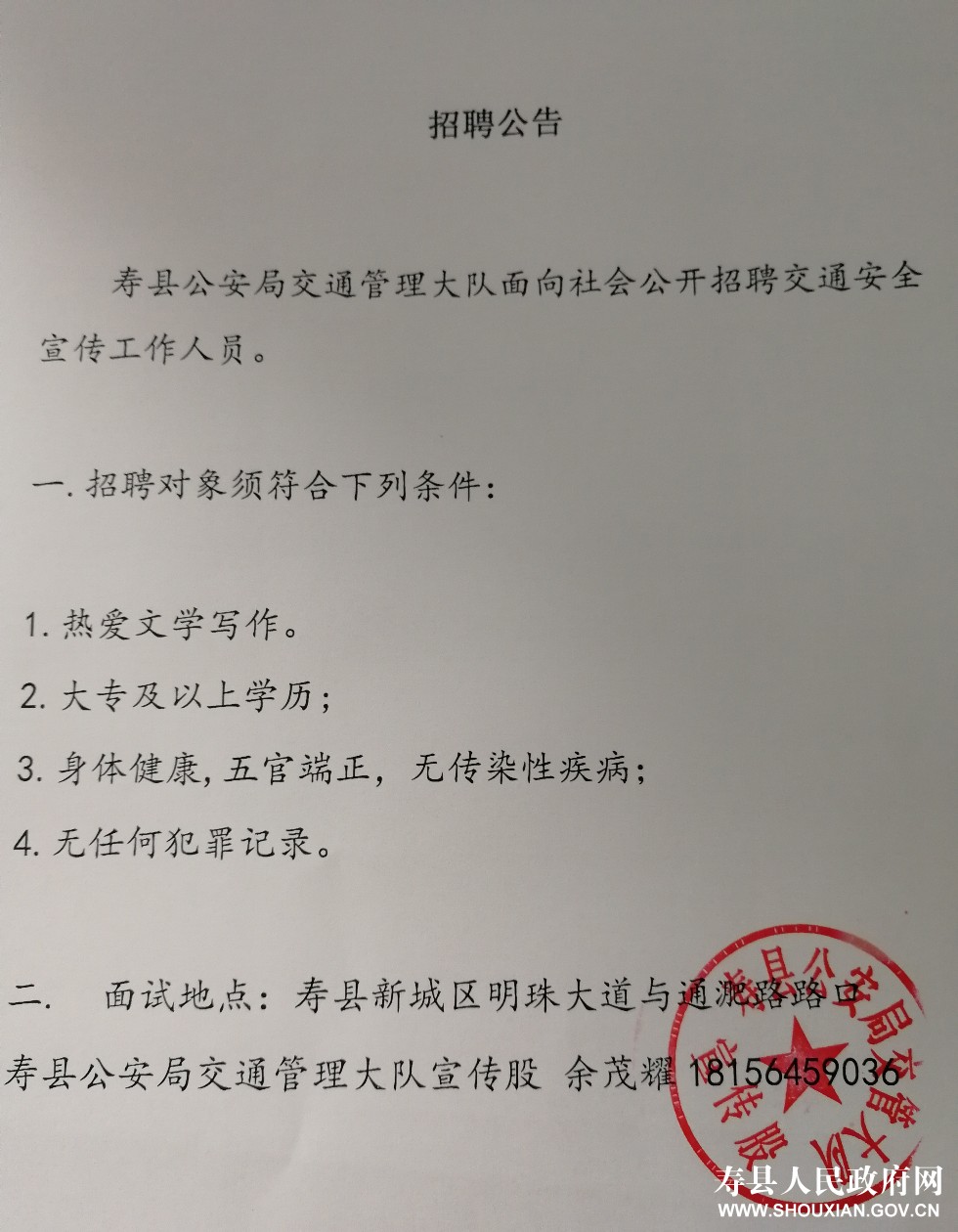 2020年淮南壽縣公安局交通管理大隊(duì)招聘交通安全宣傳工作人員公告