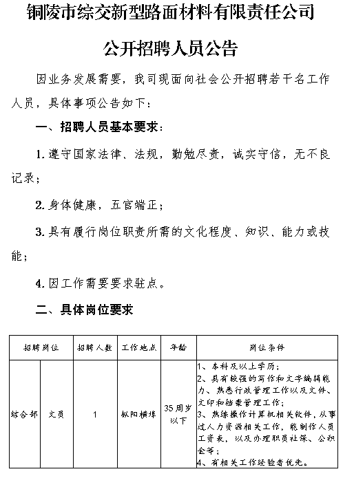 2021年銅陵市綜交新型路面材料有限責(zé)任公司公開招聘人員公告