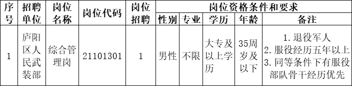 因根據(jù)工作需要,經(jīng)廬陽(yáng)區(qū)人民武裝部研究決定,現(xiàn)委托遠(yuǎn)創(chuàng)人力資源管理集團(tuán)有限公司面向社會(huì)公開招考工作人員1名,現(xiàn)將有關(guān)事項(xiàng)公告如下: