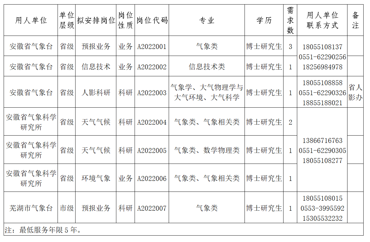 此次招聘崗位為博士崗位。具體單位、崗位、專業(yè)、學(xué)歷要求等詳見《安徽省氣象局2022年度事業(yè)單位博士研究生崗位需求表》。