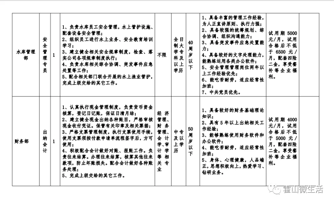 綜合管理部綜合管理專員1名、水庫管理部部門負責人1名、水庫管理部安全管理專員1名、財務(wù)部出納會計1名。