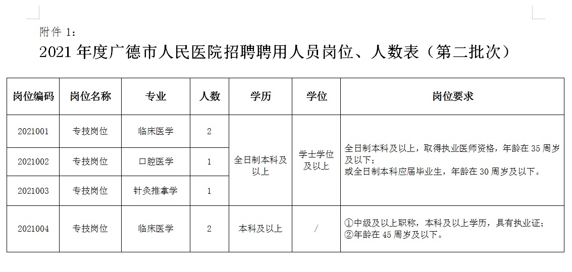 詳見《2021年度廣德市人民醫(yī)院招聘聘用人員(第二批次)崗位計劃、條件一覽表 》(附件1)。