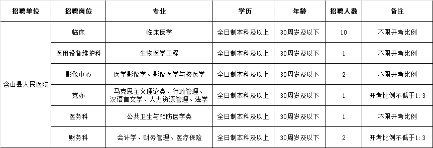 6. 開(kāi)考比例:財(cái)務(wù)、黨辦崗位計(jì)劃招聘數(shù)與報(bào)考人數(shù)的開(kāi)考比例不低于1:3;臨床醫(yī)學(xué)、醫(yī)學(xué)影像學(xué)、生物醫(yī)學(xué)工程、公共衛(wèi)生與預(yù)防醫(yī)學(xué)等四個(gè)緊缺崗位不設(shè)開(kāi)考比例。同一考生只能報(bào)考一個(gè)崗位。