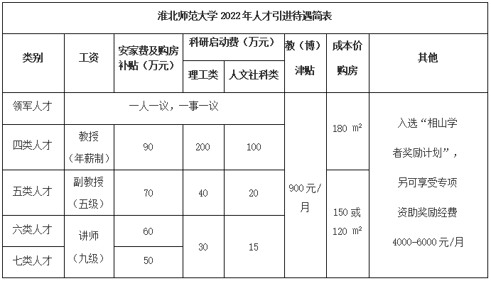 2. 四類至七類人才:引進的四類至七類人才享受《淮北師范大學人才引進待遇簡表》中相應的安家費及購房補貼、科研啟動費、教授(博士)津貼、成本價購房等待遇;其配偶具有學士及以上學位,可在校內安排工作。同時,聘期(6年)內入選“相山學者獎勵計劃”,另可享受專項資助獎勵經費4000-6000元/月。引進人才的具體聘期任務及待遇以雙方合同約定為準(教育部重點實驗室聘用人才的待遇另行約定)。