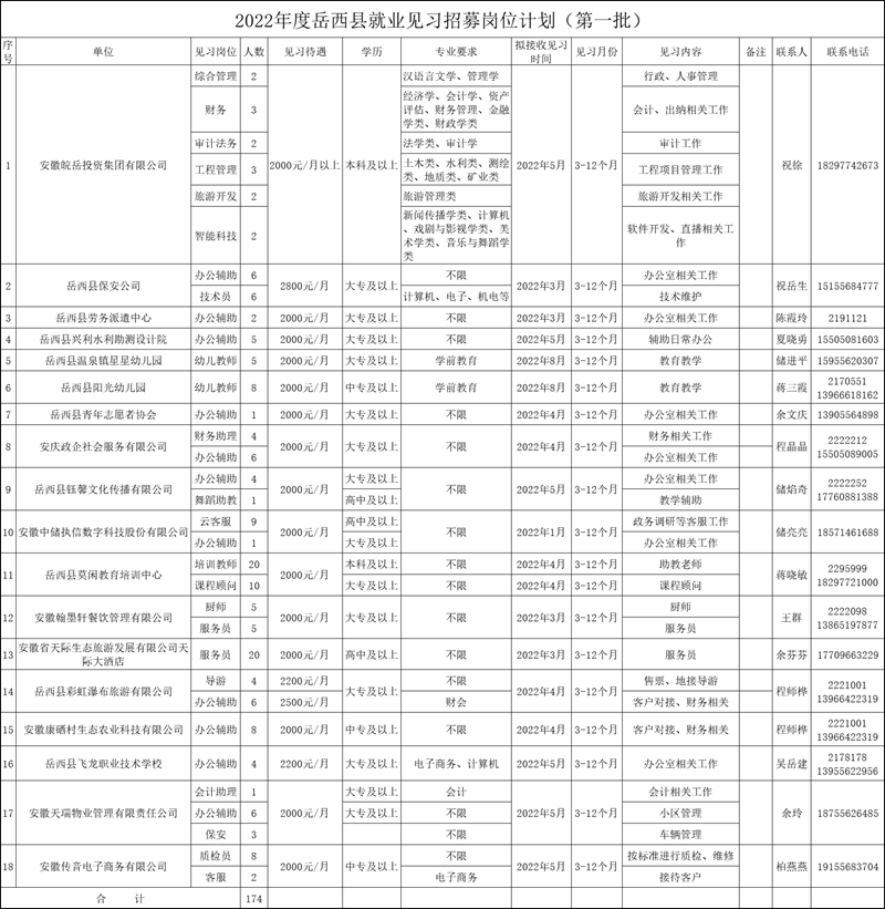 2022年5月前已征集第一批崗位174個,具體崗位情況、招聘條件、見習待遇及見習內容等見附件《2022年度岳西縣就業(yè)見習招募崗位計劃(第一批)》。