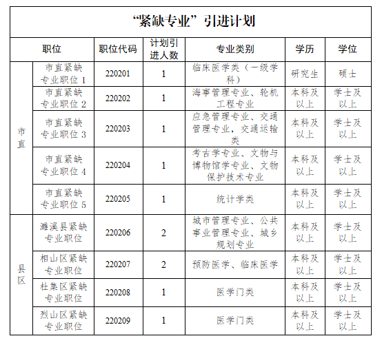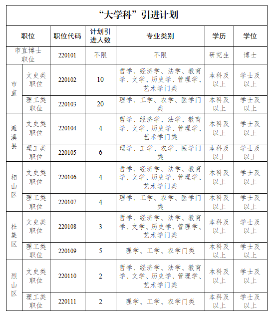 采取“大學(xué)科”+“緊缺專業(yè)”形式,市縣(區(qū))“大學(xué)科”計劃引進博士人數(shù)不限、文史類23名、理工類37名,“緊缺專業(yè)”計劃引進11名(崗位如下):