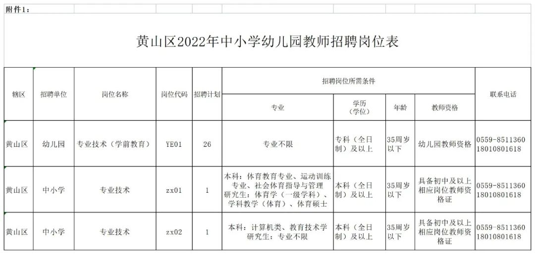 附:1.黃山區(qū)2022年中小學(xué)幼兒園教師招聘崗位表