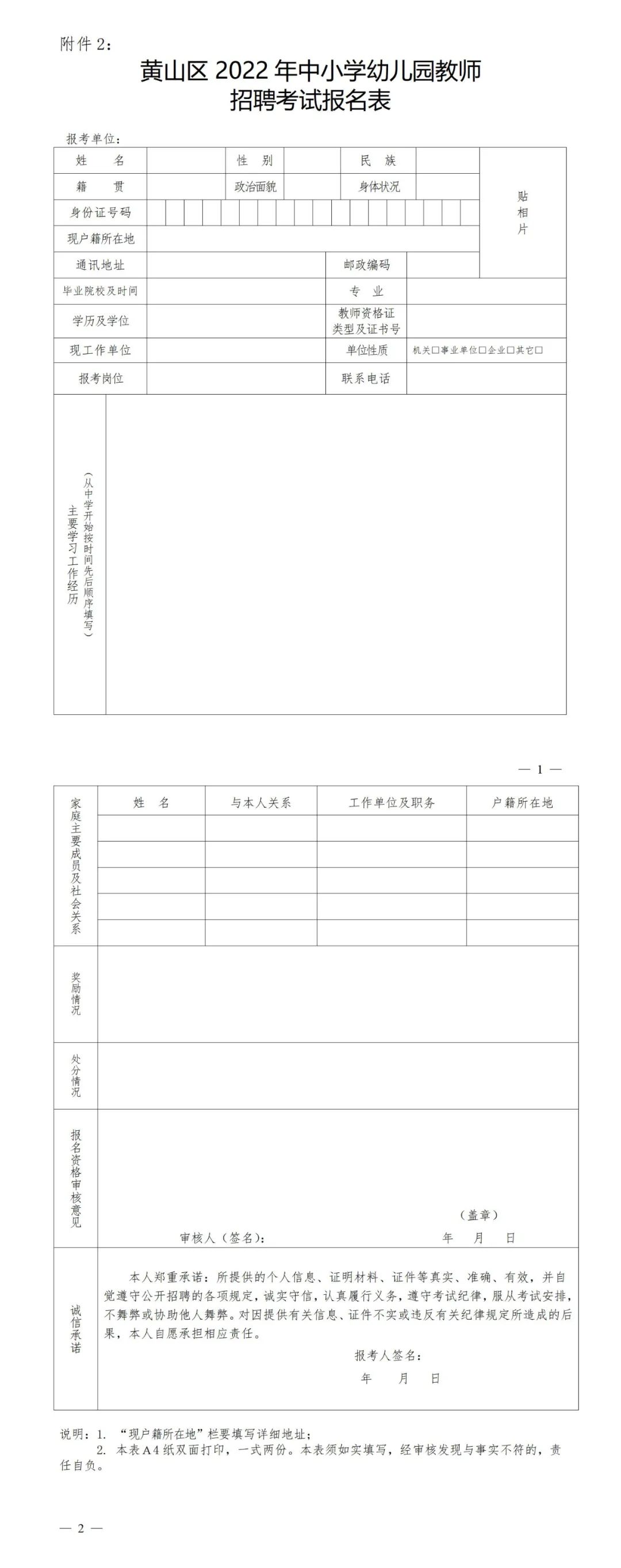 2.黃山區(qū)2022年中小學(xué)幼兒園教師招聘考試報名表