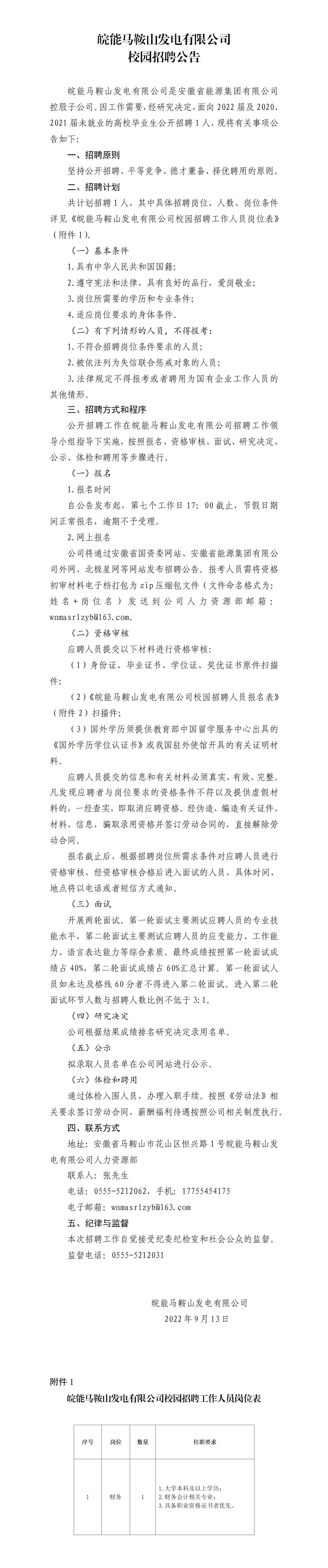 共計(jì)劃招聘1人,其中具體招聘崗位、人數(shù)、崗位條件詳見(jiàn)《皖能馬鞍山發(fā)電有限公司校園招聘工作人員崗位表》(附件1)。