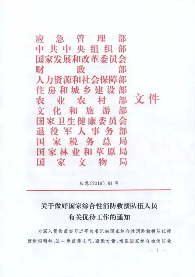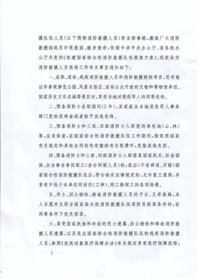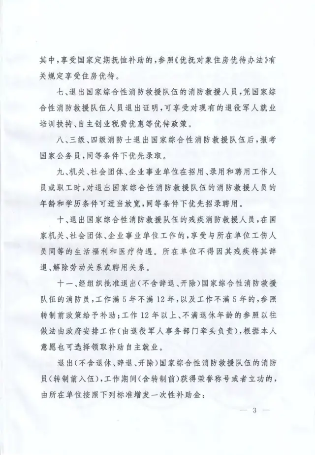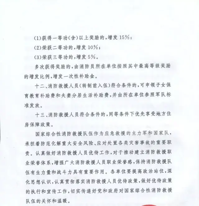 國(guó)家發(fā)展改革委員會(huì)、教育部、財(cái)政部、人力資源社會(huì)保障部、交通運(yùn)輸部、退役軍人事務(wù)部等部委與應(yīng)急管理部聯(lián)合出臺(tái)的《關(guān)于做好國(guó)家綜合性消防救援隊(duì)伍人員有關(guān)優(yōu)待工作的通知》(應(yīng)急〔2019〕84號(hào))、《關(guān)于保障國(guó)家綜合性消防救援隊(duì)伍人員交通出行優(yōu)待權(quán)益有關(guān)事項(xiàng)的通知》(交運(yùn)規(guī)〔2019〕4號(hào))等文件,明確國(guó)家綜合性消防救援隊(duì)伍人員在傷亡撫恤、退出安置、就業(yè)創(chuàng)業(yè)、家庭優(yōu)待、子女入學(xué)、住房醫(yī)療、交通出行、參觀游覽等方面享受專(zhuān)門(mén)優(yōu)待政策。