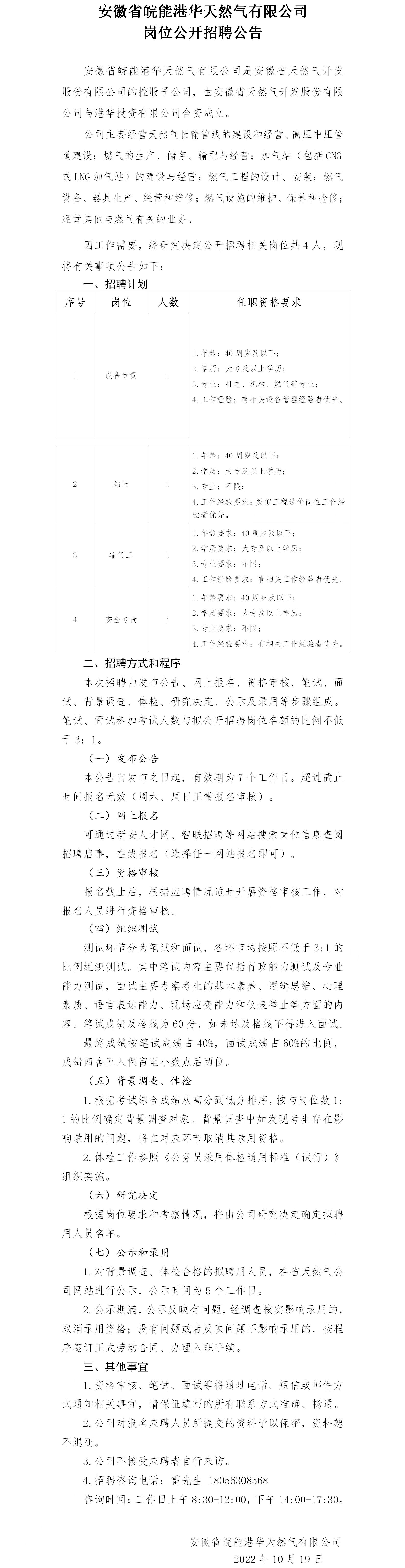 2022年安徽省皖能港華天然氣有限公司崗位公開招聘公告
