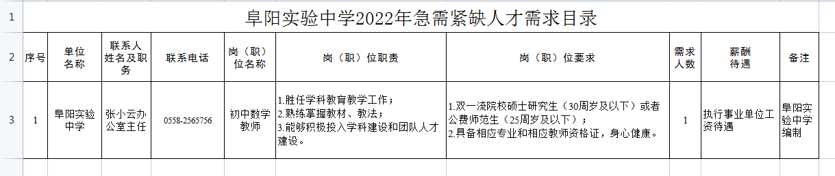 阜陽實驗中學:初中數(shù)學教師1人,阜陽實驗中學編制,全職,執(zhí)行事業(yè)單位工資待遇。