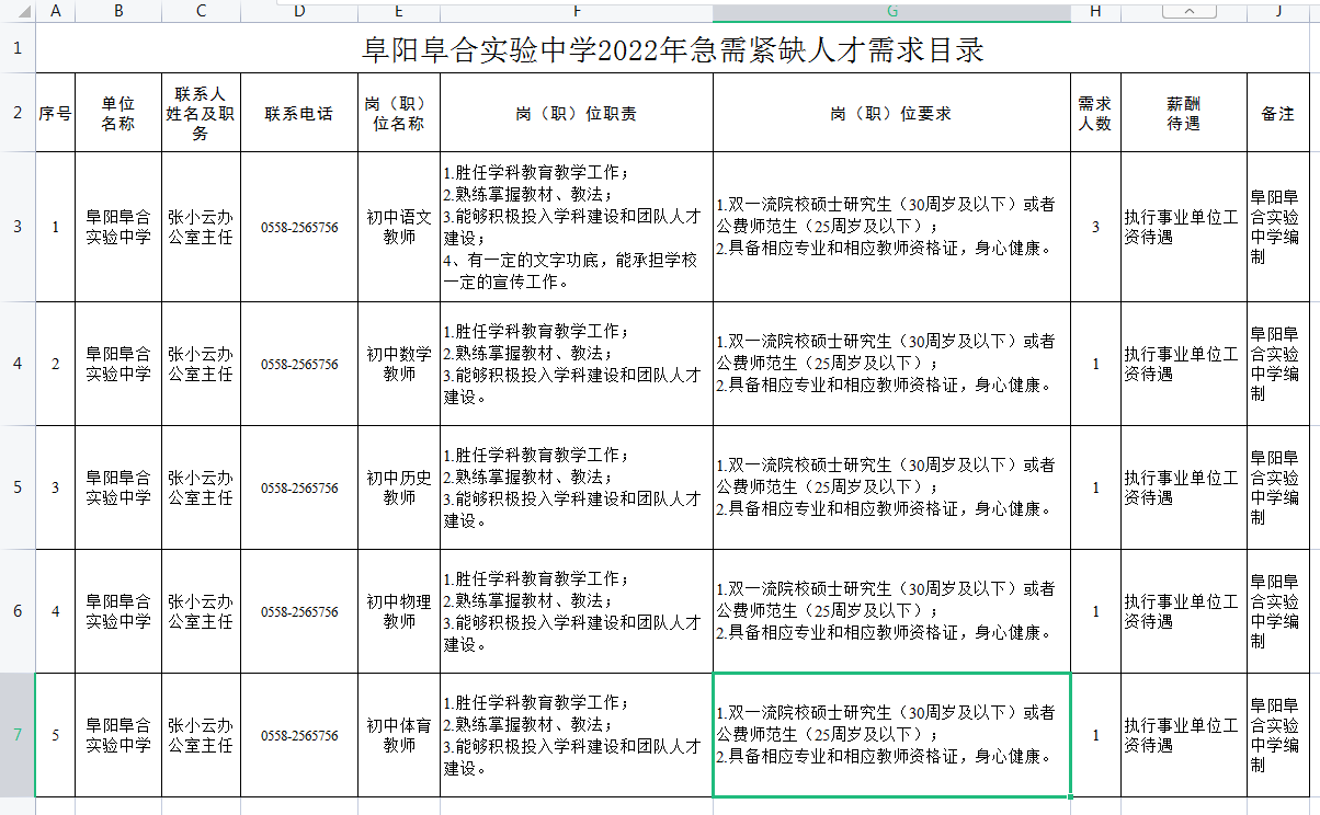 阜陽阜合實驗中學:初中語文教師3人,數(shù)學教師1人,物理教師1人,歷史教師1人,體育教師1人,阜陽阜合實驗中學編制,全職,執(zhí)行事業(yè)單位工資待遇。