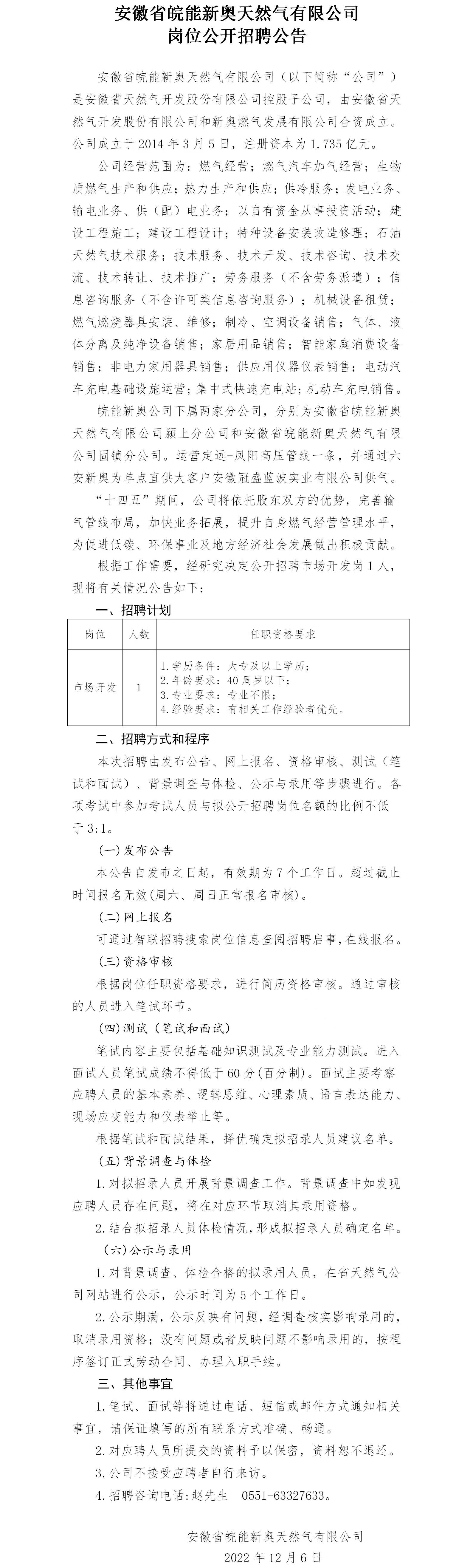 2022年安徽省皖能新奧天然氣有限公司崗位公開招聘公告