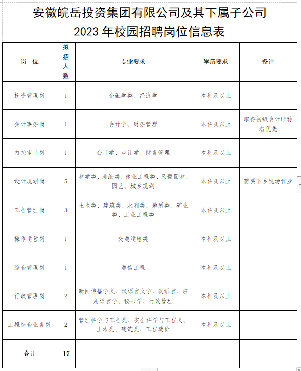 根據(jù)工作需要,安徽皖岳投資集團有限公司及其下屬子公司擬面向安徽大學(xué)、合肥工業(yè)大學(xué)、安徽財經(jīng)大學(xué)、安徽工程大學(xué)、安徽工業(yè)大學(xué)、安徽建筑大學(xué)、安徽理工大學(xué)、安徽農(nóng)業(yè)大學(xué)、安慶師范大學(xué)、安徽師范大學(xué)、淮北師范大學(xué)2023屆畢業(yè)生招錄17名工作人員,現(xiàn)就有關(guān)事項公告如下:
