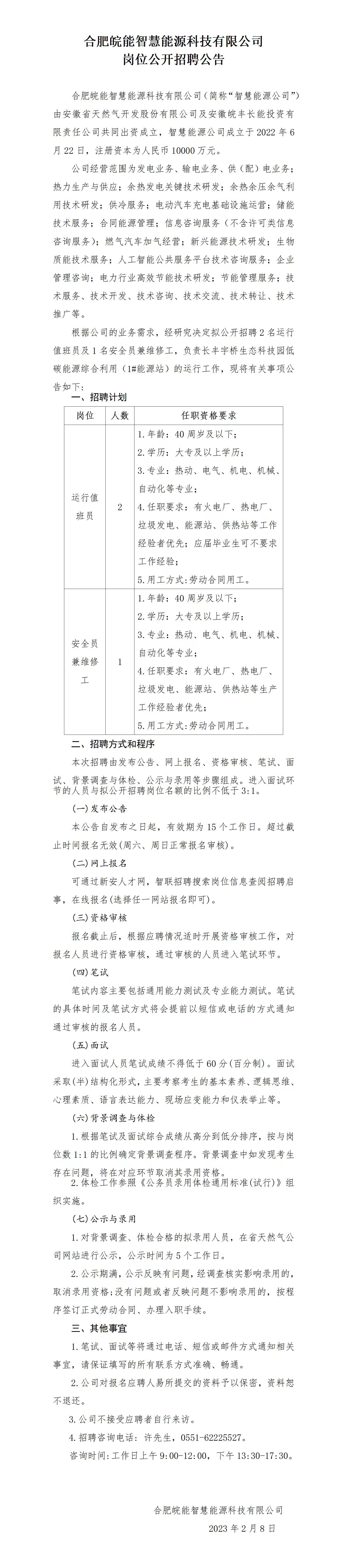 2023年合肥皖能智慧能源科技有限公司崗位公開招聘公告