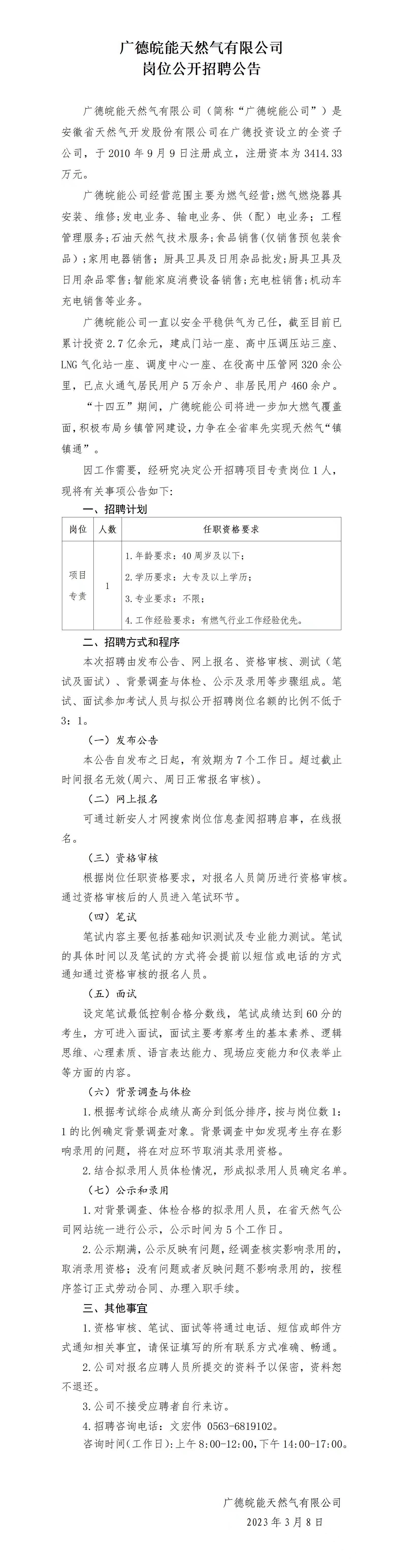2023年宣城廣德皖能天然氣有限公司崗位公開招聘公告