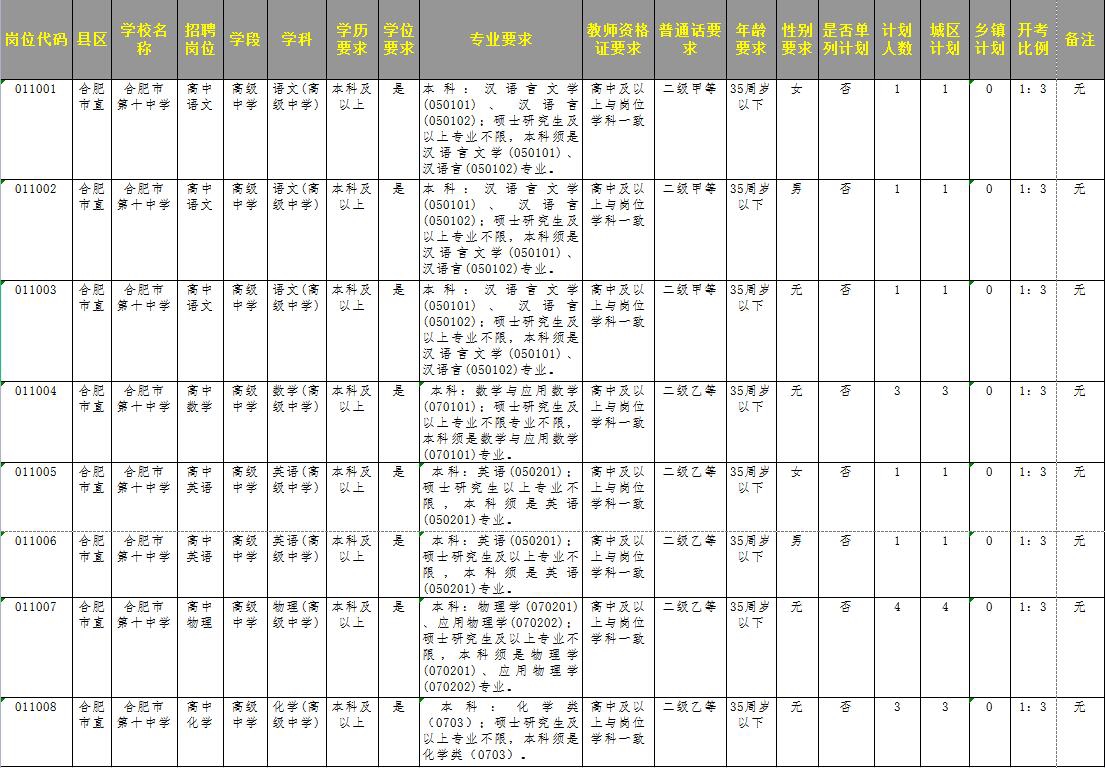 根據(jù)合肥市教育局、合肥市人力資源和社會保障局聯(lián)合發(fā)布的《2023年度合肥市直屬學校新任教師公開招聘公告》,合肥十中此次共招聘語文(3人)、英語(2人)、數(shù)學(3人)、物理(4人)、化學(3人)教師15名,具體崗位要求如下: