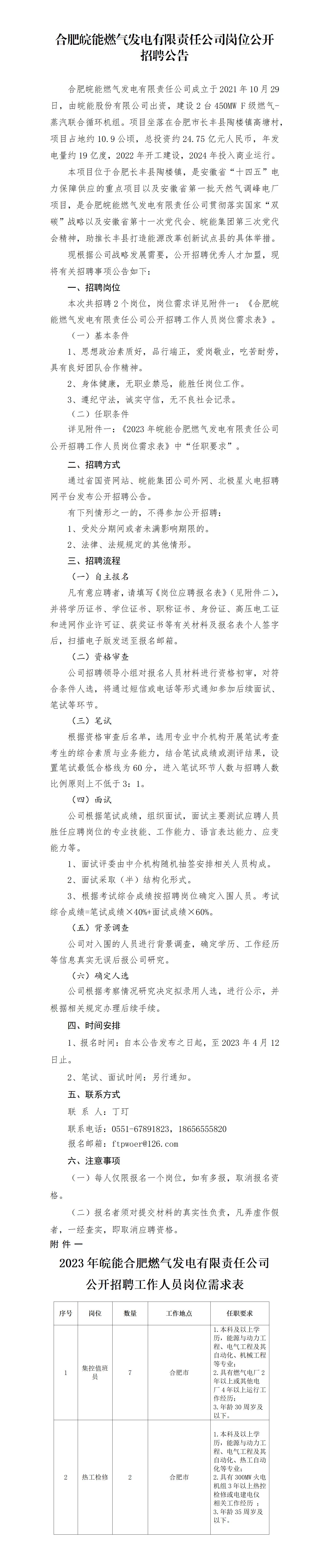 本次共招聘2個(gè)崗位,崗位需求詳見附件一:《合肥皖能燃?xì)獍l(fā)電有限責(zé)任公司公開招聘工作人員崗位需求表》。