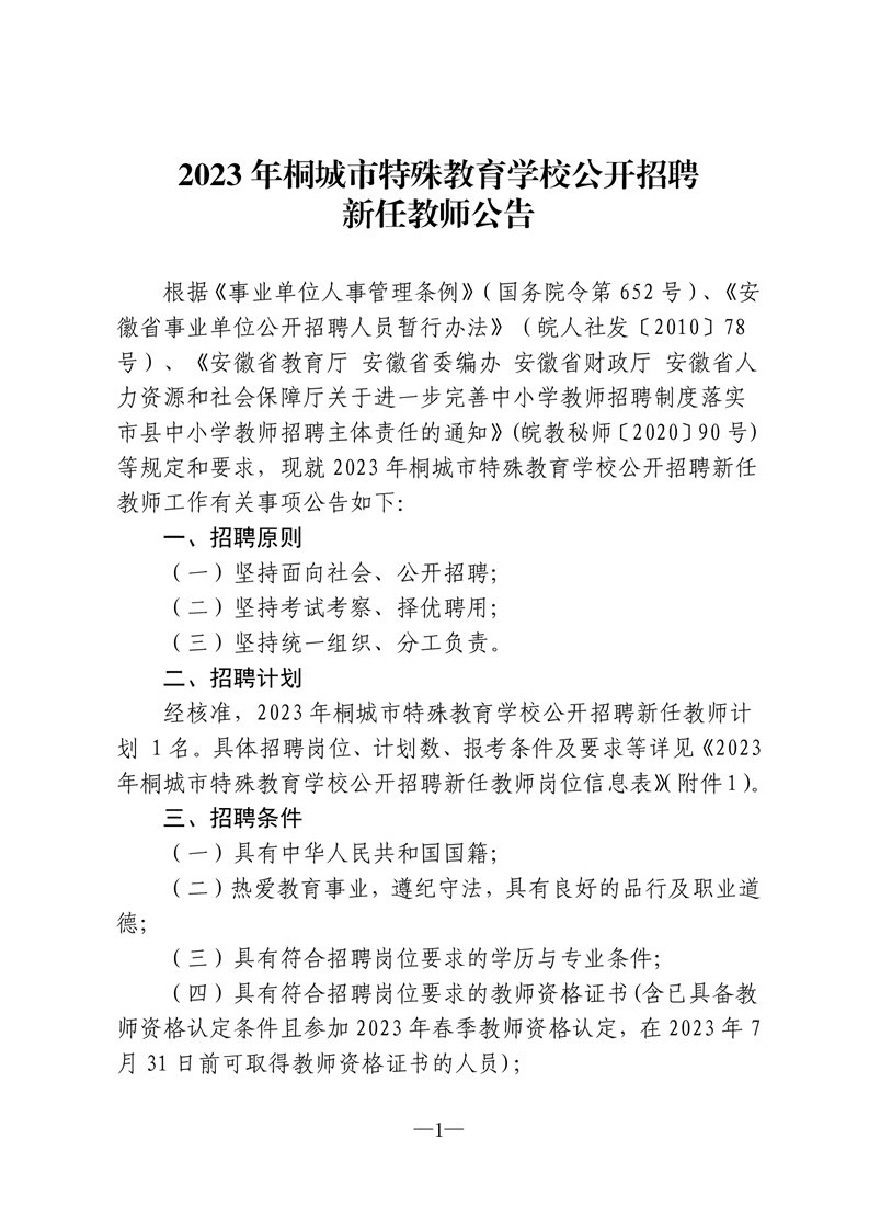 經(jīng)核準(zhǔn),2023年桐城市特殊教育學(xué)校公開(kāi)招聘新任教師計(jì)劃1名。具體招聘崗位、計(jì)劃數(shù)、報(bào)考條件及要求等詳見(jiàn)《2023年桐城市特殊教育學(xué)校公開(kāi)招聘新任教師崗位信息表》(附件1)。
